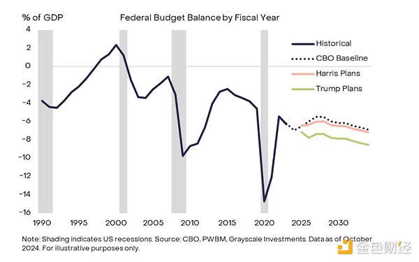 无论未来总统大选是特朗普还是卡玛拉·哈里斯获胜,美国的财政政策都可能导致更大的预算赤字。根据国会预算办公室的预测,未来 10 年,美国联邦预算赤字将平均占 GDP 的 6.2%。如果特朗普延续其 2017 年的减税政策,并进一步降低税率,赤字可能攀升至 GDP 的 7.8%。相比之下,哈里斯计划将企业税率提高至 28%,但她的其他改革提案仍可能使赤字占 GDP 的比例达到 6.5%。