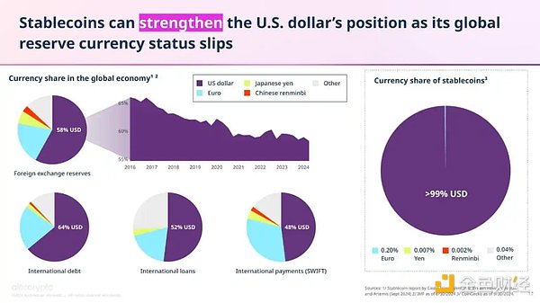 稳定币作为当前最受欢迎的加密产品之一,已经成为政策讨论的焦点话题,美国国会正在审议多项相关法案。推动这一讨论的关键因素之一,是认识到稳定币有助于在美元全球储备货币地位逐渐削弱的情况下,继续强化其国际影响力。目前,超过 99% 的稳定币以美元计价,远超第二大计价货币——欧元,后者仅占 0.20%。稳定币的广泛使用使得美元在数字资产市场中的主导地位更加巩固,同时也为美国在全球金融体系中保持优势提供了新的途径。