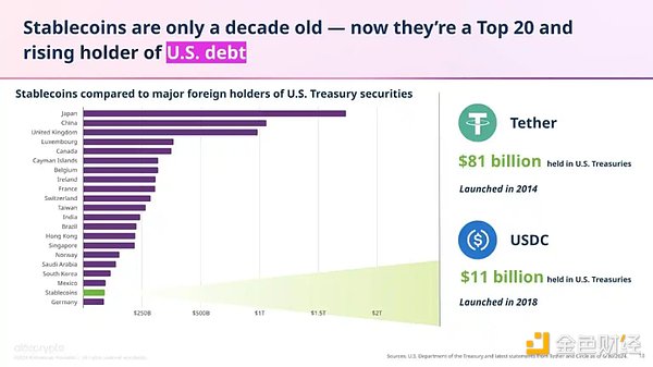 除了在国际上增强美元的影响力,稳定币还可能在国内进一步巩固美国的金融基础。尽管稳定币发展仅有十年,它们已经成为美国国债的前 20 大持有者之一,超越了德国等国家。这表明,稳定币不仅有助于提升美元的全球主导地位,还能够通过吸纳大量国债,成为美国金融体系的重要组成部分,为经济提供额外的流动性支持。