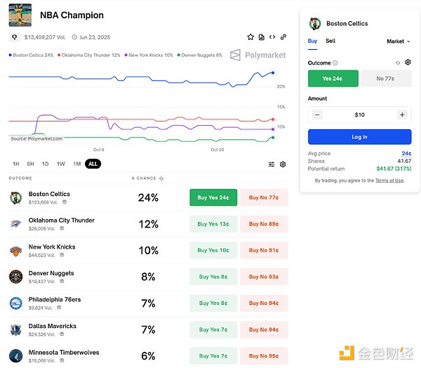 除了上例所示的二元市场之外,Polymarket 还提供分类市场和标量市场。分类市场允许用户对多个选项下注,每个选项最终价值为 1 美元或 0 美元,具体取决于结果。例如,市场预测 2025 年 NBA 总冠军可能包括凯尔特人、雷霆、尼克斯、掘金等选项,由于现在常规赛刚刚开始,一切都不确定,用户可以选择同时下注多个球队。标量市场的运作方式与上述两种类型的市场有所不同,其盈利和结算取决于最终结果在预定范围内的位置。