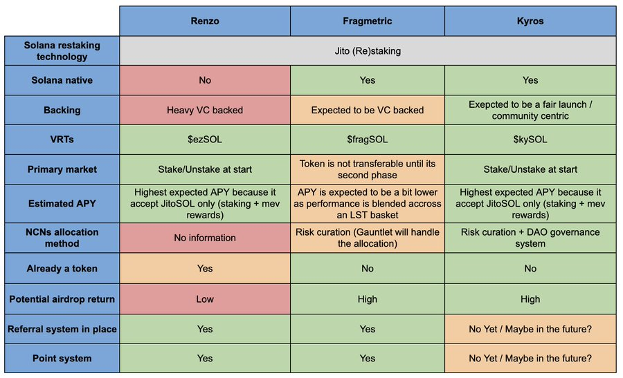 2.APY 回报:每个项目的 APY 预计相似,但可以认为 Renzo 和 Kyros 因仅使用 JitoSOL,预期 APY 可能略高于 Fragmetric,但差距不会很大。