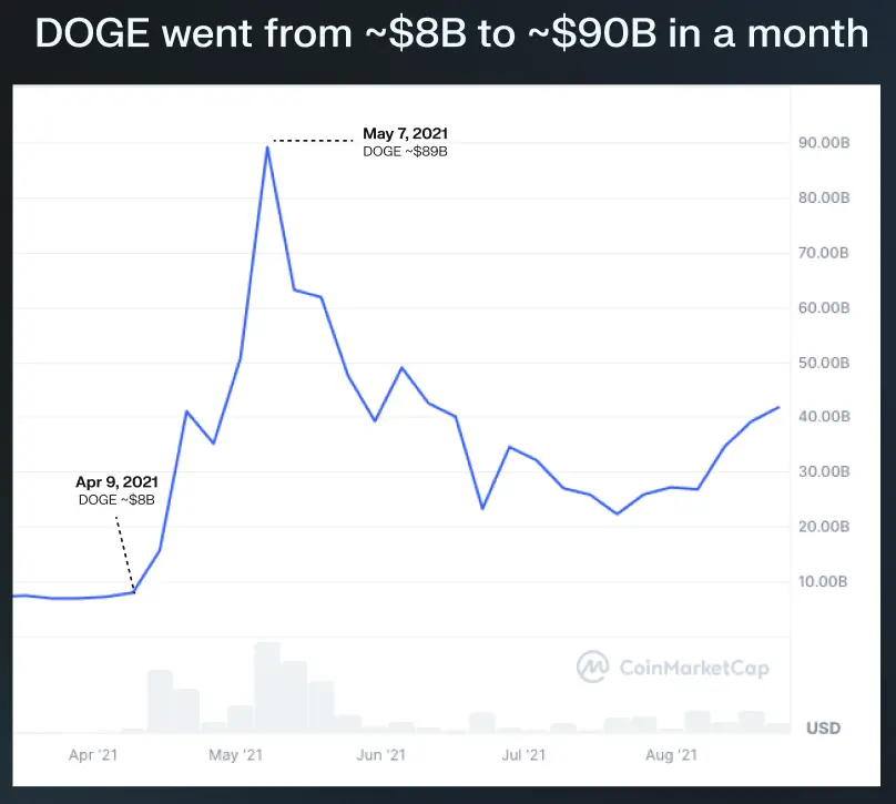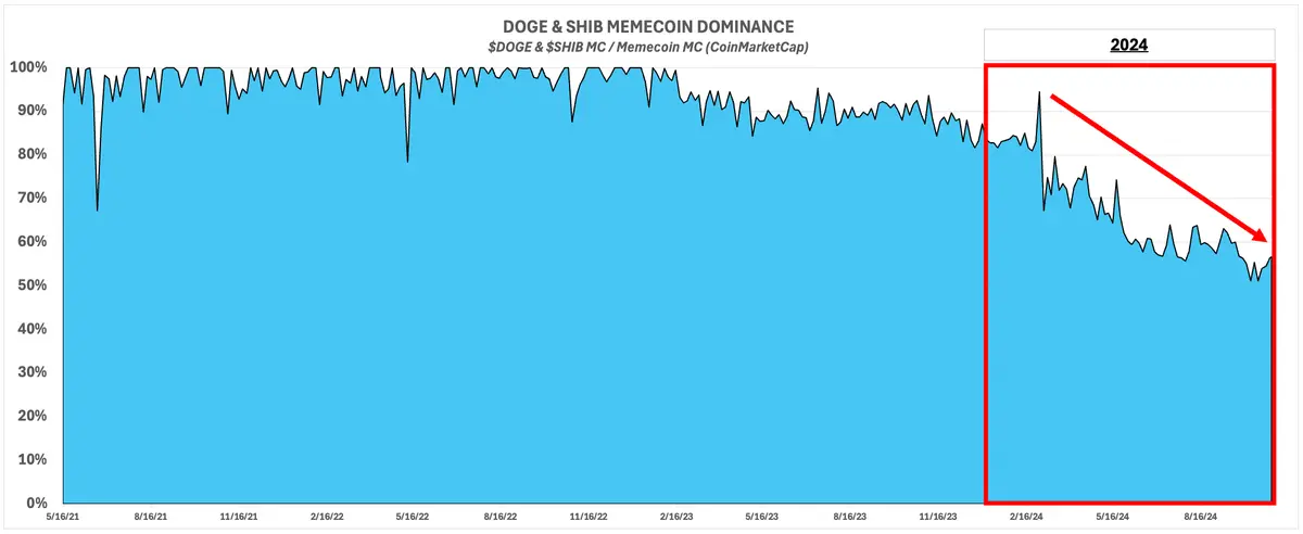 今年大部分的价值增长来自于非 $DOGE / $SHIB Meme 币的爆炸性增长。目前 DOGE 和 SHIB 的市场主导地位已降至约 57%: