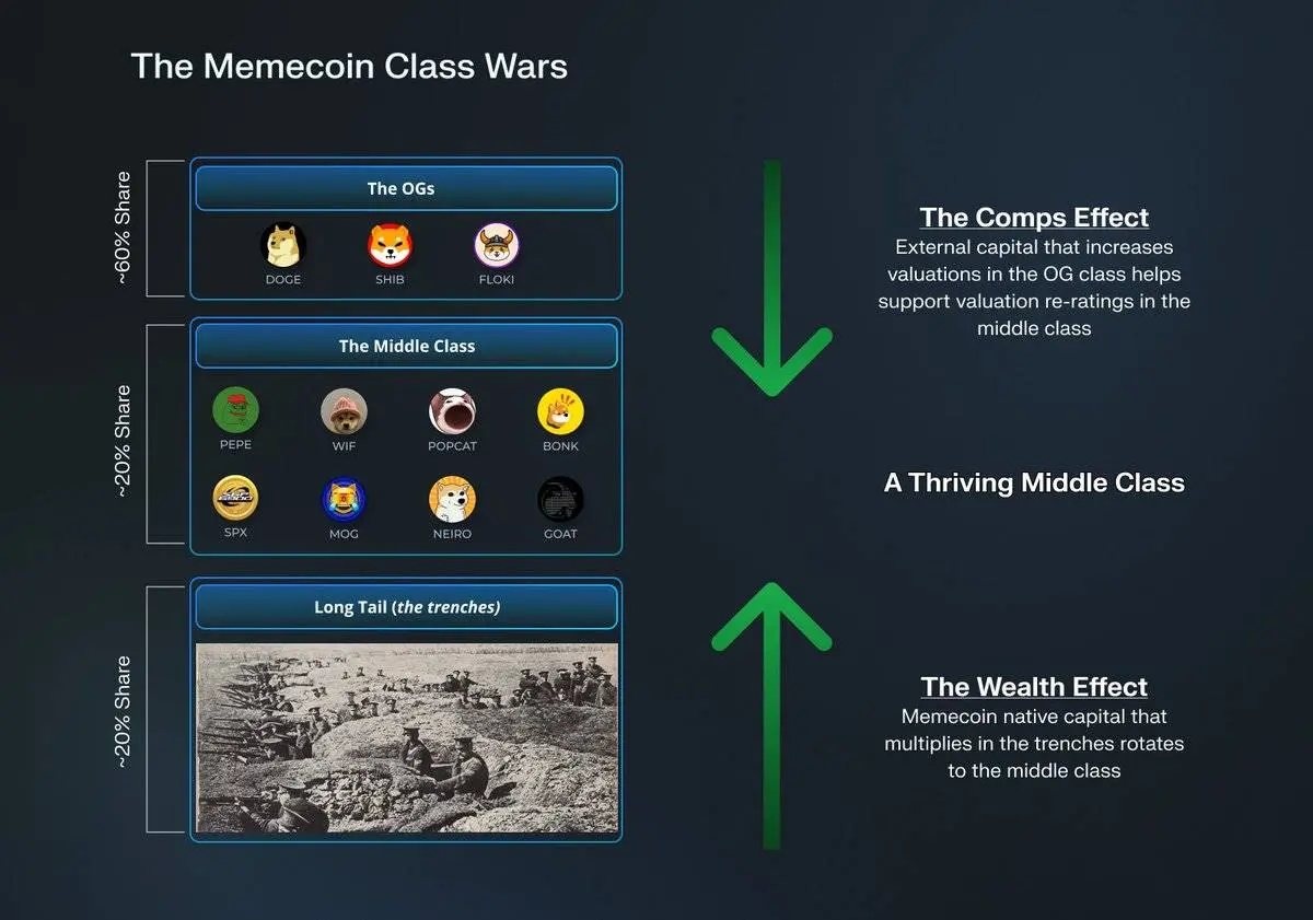 我也看到一些中产阶级有潜力升级到大盘股类别($PEPE 基本上已经达到了这个水平)。资本自然会不成比例地集中到高市值资产,因为投资者大多懒惰,喜欢寻找确认偏差。