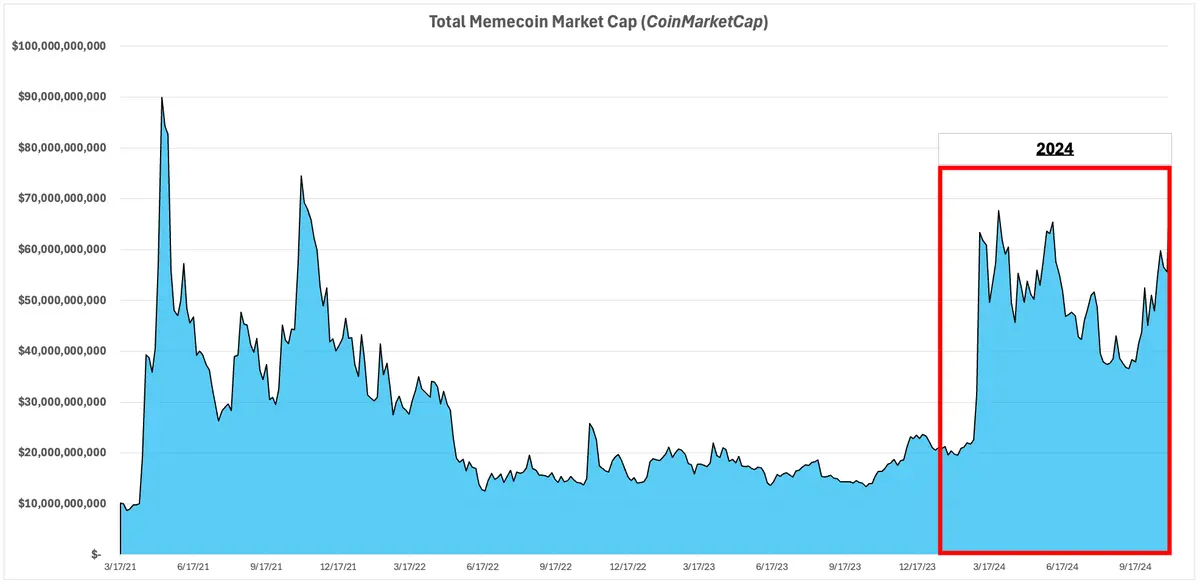 我认为,在没有 $DOGE / $SHIB 显著上涨的情况下,推动 Meme 币市场份额的难度越来越大。 2024 年,整体 Meme 币市场总市值大幅上升,已接近 2021 年的历史最高点(ATH):