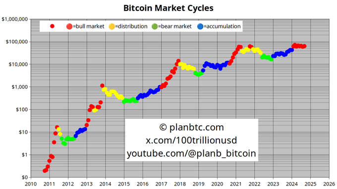 10 月:经典暴涨月,BTC 达到 70,000 美元。PlanB 预测,比特币价格将在 10 月迎来一轮强劲上涨。他认为比特币的暴涨可能会被全球市场波动性加剧和投资者信心的恢复所驱动,这也是比特币在历史上多次表现出价格暴涨的时点。