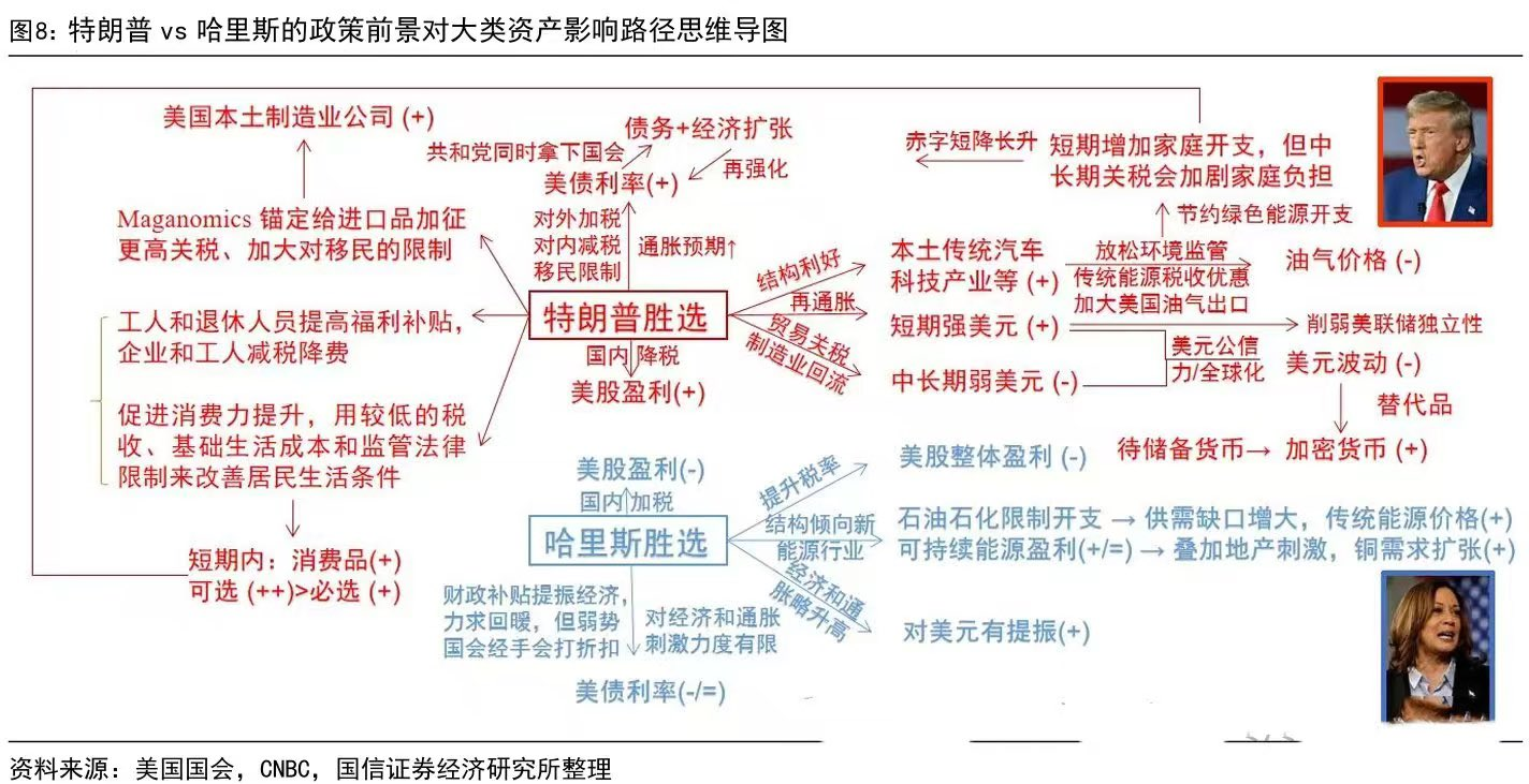 若哈里斯当选,市场倾向于重视她扩展医保和扩大医疗补助的政策。医疗保健领域股票可能迎来利好,但整体上美股承压。此外,美元和美债在短期内可能走强,市场对可能的监管和企业税收政策保持警惕,整体股票市场的信心或受到抑制。