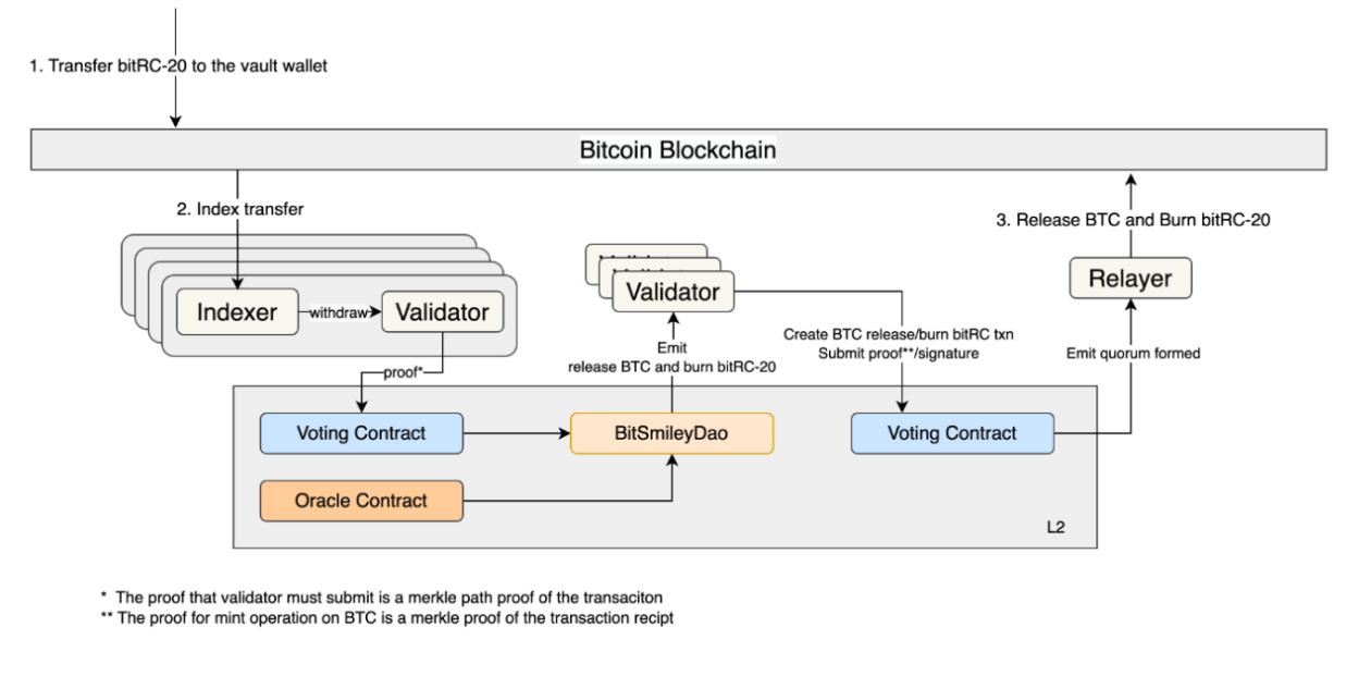 预言机将把比特币主网上的信息传递到部署在比特币 Layer2 上的 bitSmileyDAO。在接收到预言机信息并进行共识验证后,bitSmileyDAO 会向比特币主网的验证者回传信息,从而在比特币主网实现 bitUSD 的铸造或销毁。