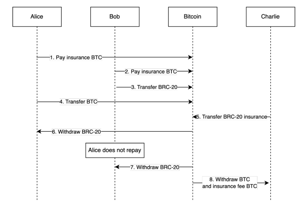 贷款人设置自己愿意提供的 bitRC-20 代币种类和数量、贷款期限和贷款利率来在 bitLending 上发布 offer。借款人可以发起借款请求后,bitLending 将进行撮合,一旦 offer 匹配,预计偿还区块与资金本息将被确定,同时会生成一个多签钱包用于借贷双方的交接。双方分别对交易进行签署,将 bitRC-20 资产与比特币转入该多签钱包,在得到网络确认后,借款人便可以取走借款。