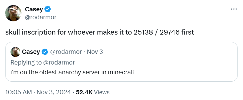 这样一个人是怎么知道 Casey 在送这么重要的铭文的?是「老鼠仓」?不不不,因为信息传递到了一个专播玩 2b2t 服务器的主播 riths 那里。