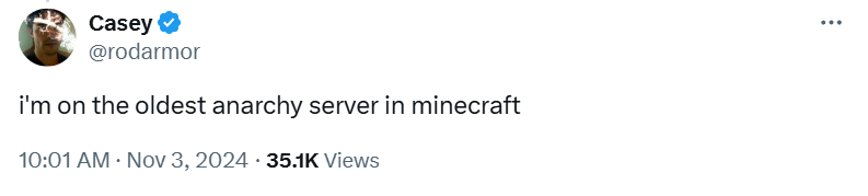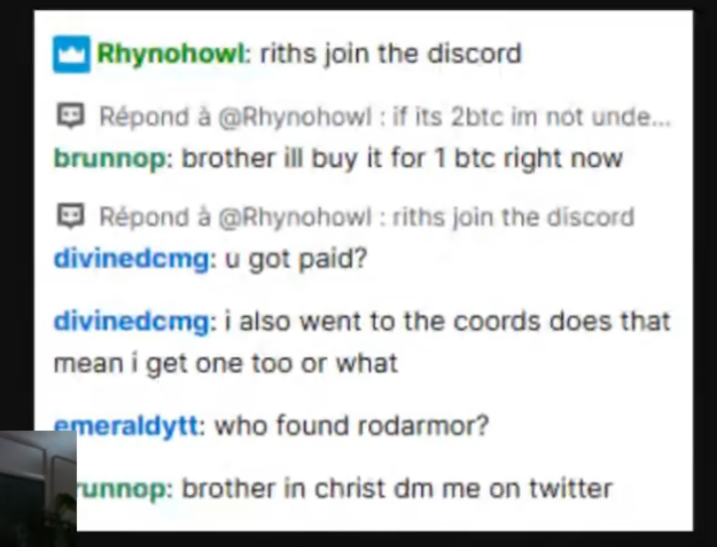 人生总是充满惊喜和意外,对 @Rhynohowl1 来说,在事情发生之前,那可能只是一个再普通不过的周六(我们的时区是周日)。他打开电脑,打开 Minecraft,进入 2b2t 服务器游玩,同时在 riths 的 Twitch 直播间收看和聊天。突如其来的一个讯息,他开始在 Minecraft 这个虚拟世界中寻找 Ordinals & 符文协议的创始人。当这位在另一个虚拟世界中响当当的人物以一个可能在他看来并不特别的 Minecraft 形象出现在他的眼前时,他收获了 1 BTC。