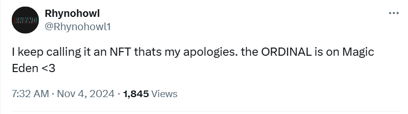 他还特意发了条推文回应 Ordinals 玩家们的评论——抱歉,不是 NFT,是 Ordinals