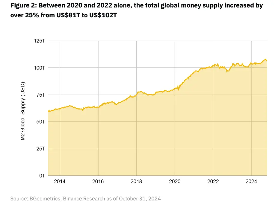 图2显示:2020年至2022年间,全球货币供应总量从81万亿美元增加到102万亿美元,增幅超过25%。