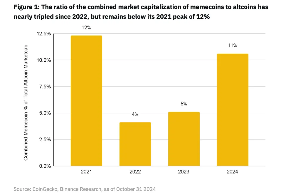 自2022年以来,迷因币的总市值占比(不包括BTC、ETH和稳定币)从4%增加到2024年的11%。
