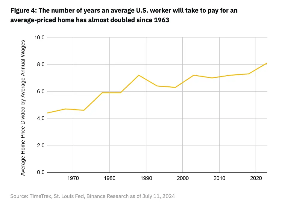 工资增长无法跟上房价上涨速度。图4显示:购买平均价格房屋所需的平均工资年数从1963年的4.4年增加到2021年的8.1年,几乎翻倍。