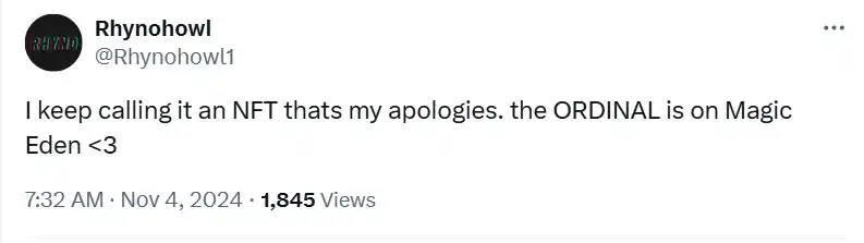他还特意发了条推文回应 Ordinals 玩家们的评论——抱歉,不是 NFT,是 Ordinals