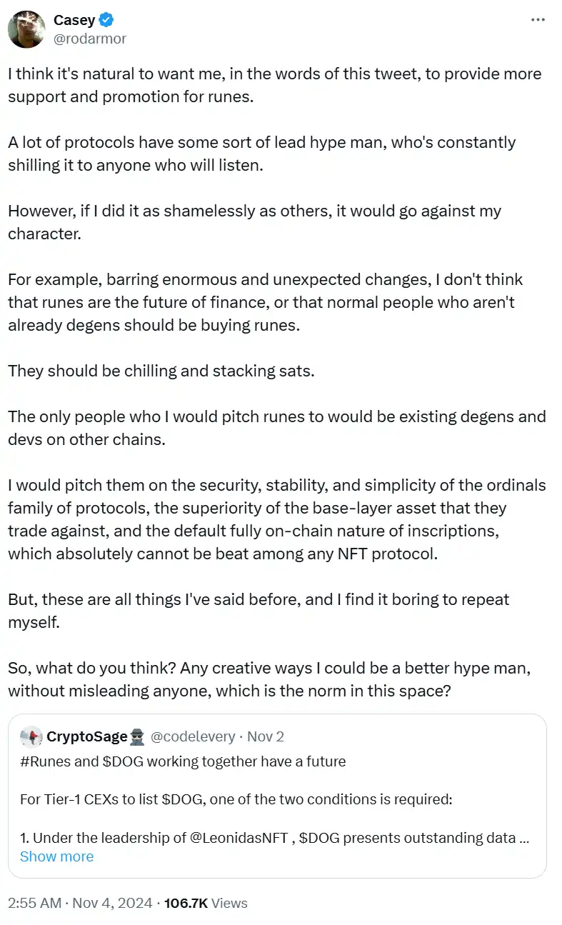 从发布符文「MEMENTO•MORI」开始,Casey 开始更加活跃,做一些推动符文生态的尝试。在这个解谜游戏结束后,昨天凌晨,Casey 发布了一条长推文,表示自己不想像其它生态的「首席推销官」那样疯狂喊单一个又一个特定的币,希望听取大家的意见,有一些好的方法帮助推动符文乃至 Ordinals 生态。
