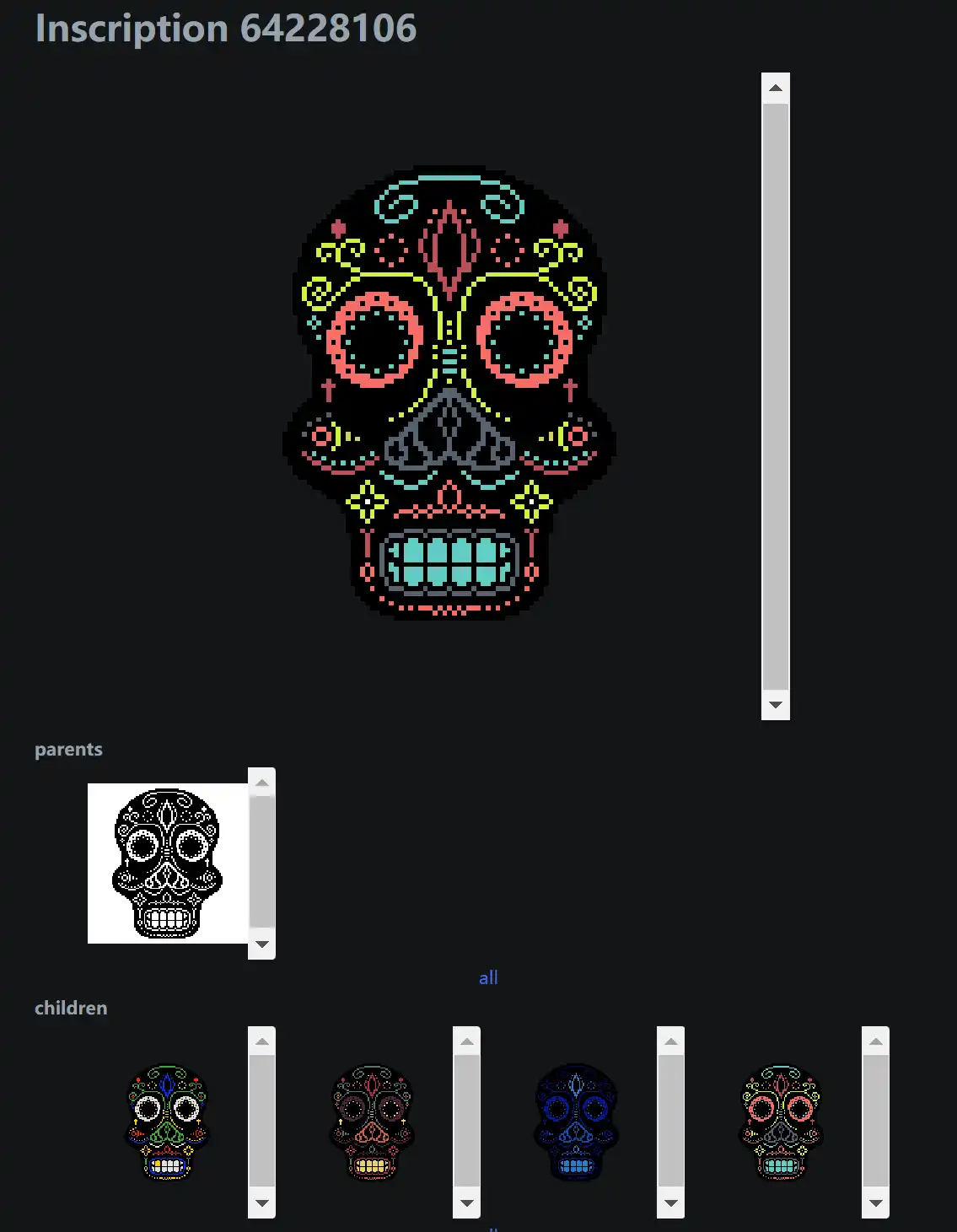 这里最上层的铭文是 0 号铭文,对其它项目来说,也可以是一个 TXT 文本铭文,用以表示合集的名称。第二级铭文可以是合集的 Logo,这里的第二季铭文实际上是一个 GIF 动图,轮动显示着「Dia De Pixales」合集的 9 个「头骨」,而最后一层的铭文则是具体的每一个 NFT 内容图片。通过这样的逐级联系,即使没有交易市场的合集上架,也可以在链上非常直观地整理出一个 NFT 合集并呈现给用户。