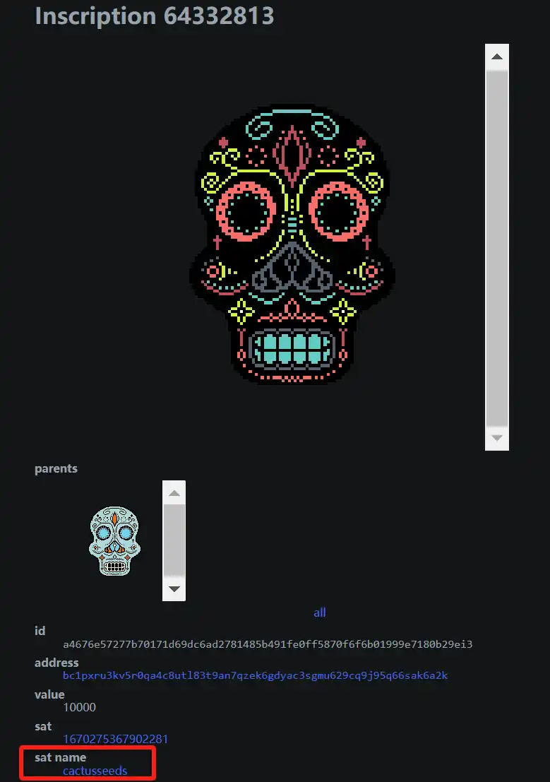 至于这个孙铭文为什么叫「cactusseeds」?这得要问 Casey。不过,这里我们也可以再看到如何对合集中具体的单个 NFT 命名的方式,那就是有意的找具有对应名字的聪。