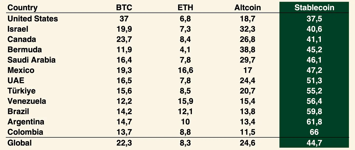 在面临严重货币贬值的新兴市场中,稳定币成为对抗本地货币不稳定的工具。阿根廷、土耳其和委内瑞拉等国家的居民纷纷采用稳定币,以应对本地货币贬值。例如,阿根廷的稳定币交易量远高于全球平均水平,达到 61.8%,这主要是由于通货膨胀和对美元替代品的需求推动。