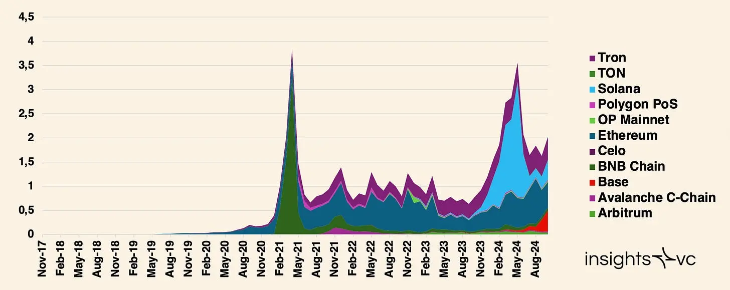 截至 2024 年 10 月,以太坊、Tron、Arbitrum、Coinbase 的 Base 和 Solana 是主要的稳定币结算区块链。尽管以太坊在整体结算价值上处于领先地位,但由于其网络交易费用较高,每月的发送地址数量少于像 Tron 和 Binance Smart Chain 这样费用较低的网络。由于发送地址比原始交易计数更难被操控,这些指标揭示了一个复杂的格局,其中 Tron、Polygon、Solana 和以太坊在稳定币活动中处于领先地位。