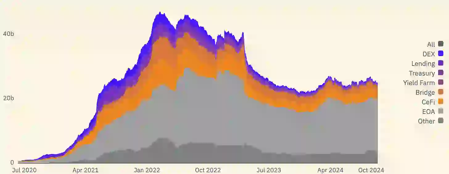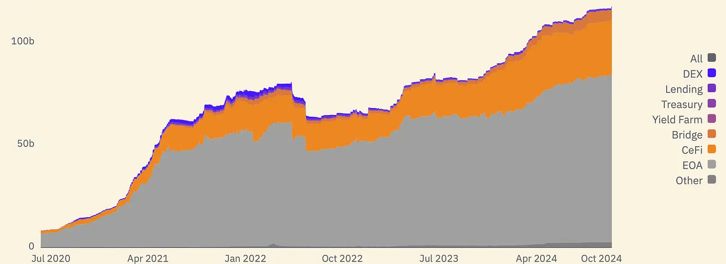 相比之下,USDT 的分布更为集中,外部拥有账户 (EOAs) 中持有 815 亿美元,而中心化金融 (CeFi) 中持有 263 亿美元。桥接资产持有 51 亿美元,去中心化交易所 (DEXs) 持有 4.73 亿美元,借贷协议持有 4.39 亿美元。国库账户持有较少,仅为 5400 万美元,收益耕作仅为 100 万美元,其他持有总计 25 亿美元。