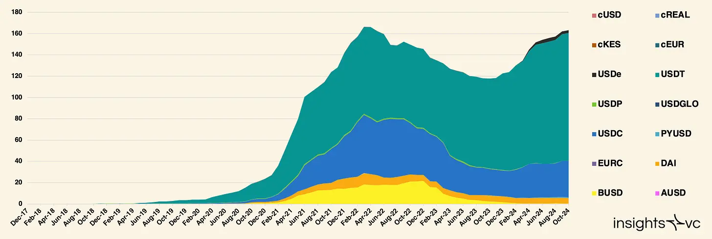 USDT 和 USDC 在稳定币市场中占据主导地位,是供应和交易量的主要组成部分。其他稳定币如 DAI、BUSD,以及新兴的 PYUSD,虽然份额较小但在不断增长,显示出市场的多样化趋势。