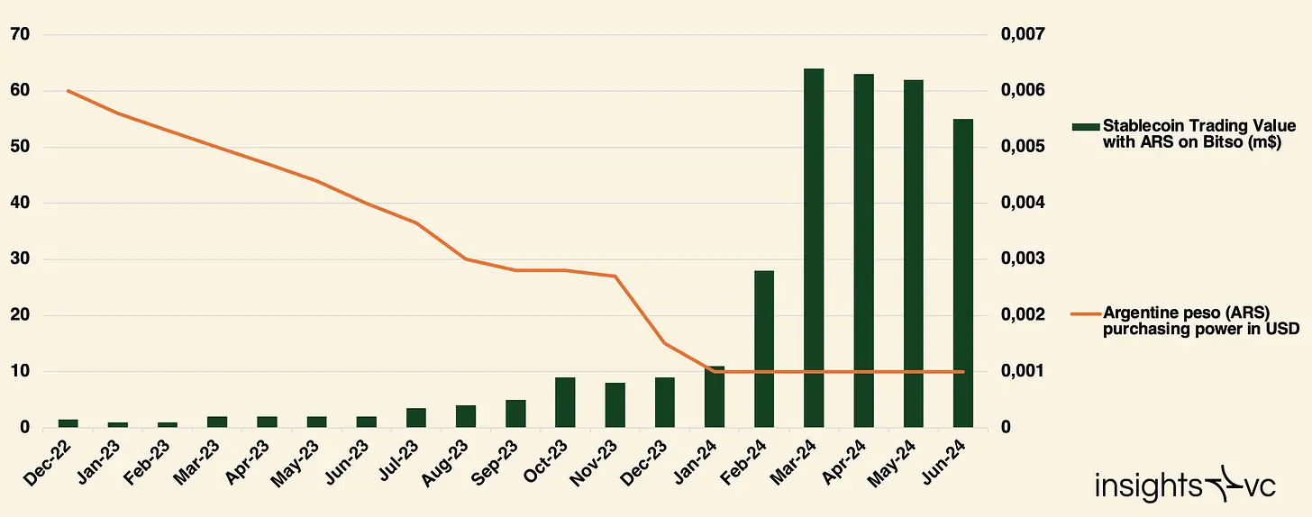 Bitso 上的稳定币交易量 (百万美元) 对比阿根廷比索 (ARS) 的美元购买力