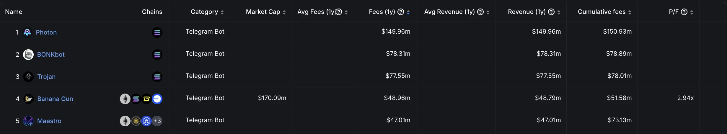 服务类平台则更为多样化一些,既包括曾经的「NFT 市场王者」OpenSea,也包括 DEX Screener 这样的聚合交易类平台,还包括 Photon、BONKbot、Trojan、Banana Gun、Maestro 等一众 Telegram 生态交易 bot,当然,从下图中我们也能看出,Solana 生态仍然是这些项目的主攻方向。