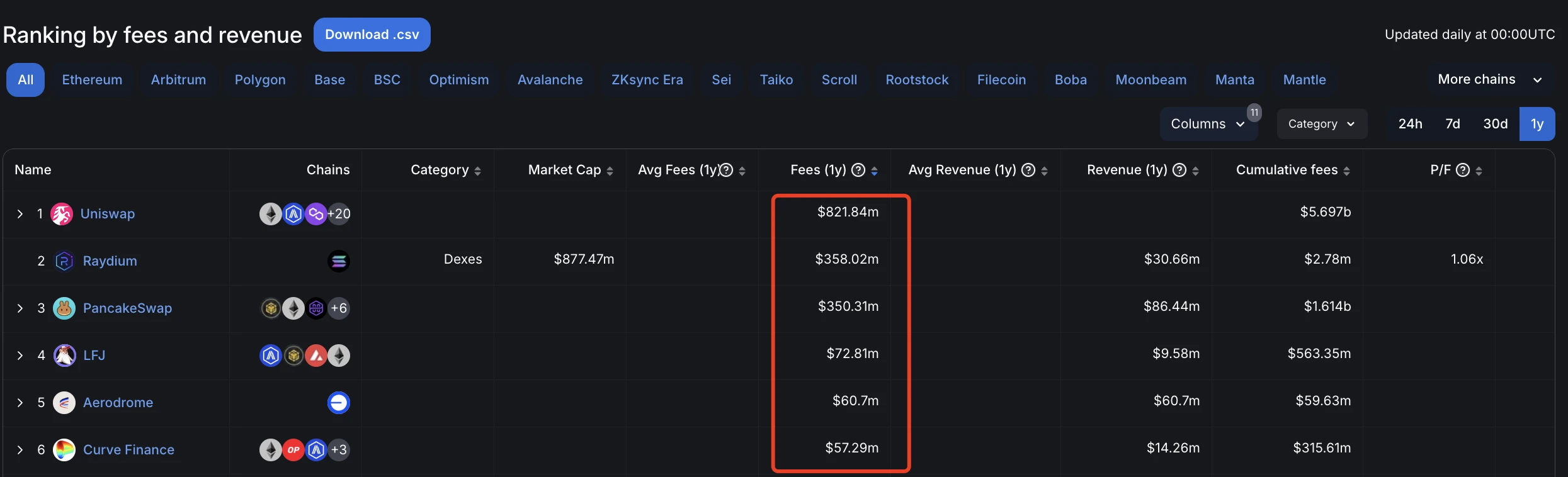 2.Uniswap、Raydium、PancakeSwap 等 DEX 则位居此类项目的第二梯队,一年内协议收入从 3.5 亿美元到 8.2 亿美元不等;