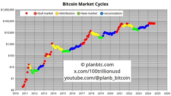 PlanB 是比特币 Stock-to-Flow(S2F)模型的创造者,以其独特的资产稀缺性与价格关系模型在加密行业内享有很高声誉。他的分析着眼于比特币长期价值的成长潜力,尤其是在减半事件后的价格波动。他的最新预测指出,如果特朗普赢得即将到来的总统大选,比特币市场可能会迎来一场前所未有的价格飙升。PlanB 通过构建一系列月份时间表,展示了不同市场情景下比特币的价格发展方向。