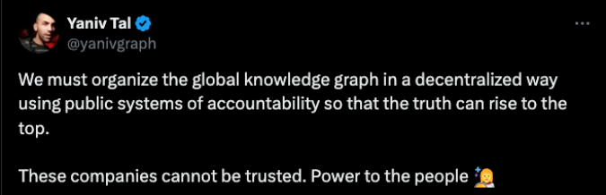 我们相信,去中心化知识图谱可以实现区块链和 AI 最完美的结合——也就是说,这个解决方案可以连接世界上的所有数据,并通过深思熟虑的创造、策展、组织和组合,以易于探索的方式将它们连接起来。以前,知识图谱通常由公司或具有独特知识库的群体,以集中化的方式进行构建,并持续更新。虽然这是一种很棒的解决方案,能满足特定的需求,但它不符合我们对这项技术未来的期待:成为未来互联网的基础。