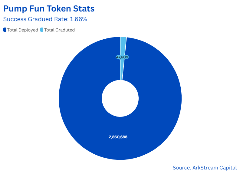 新晋 Meme 币涨幅和低成功率:Meme 市场中不断有新币种涌现,它们的涨幅有时甚至超过了 BTC 等主流加密货币。这表明 Meme 代币领域具有较高的波动性和投机机会。然而,在众多新 Meme 中,以 Pump fun 数据为例,成功发射的 Memes 仅有不到 2%,当前市值维持在 1M 之上的仅有 0.23%,也就是说能够经受时间考验并存活下来的概率极为渺小。