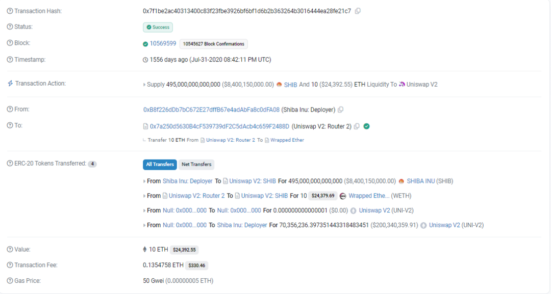 SHIB 的第一笔 LP 添加交易:https://etherscan.io/tx/0x7f1be2ac40313400c83f23fbe3926bf6bf1d6b2b363264b3016444ea28fe21c7