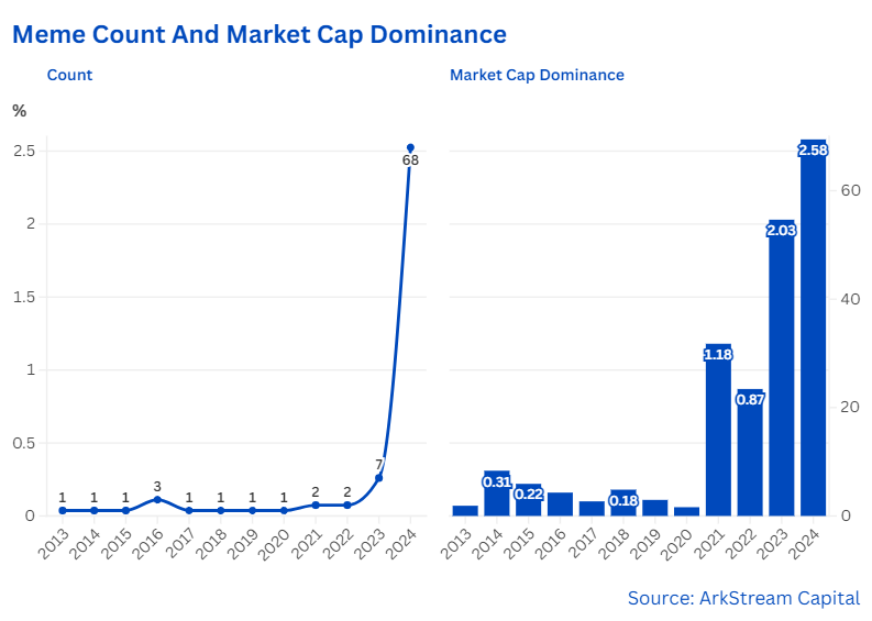 3、截止 2024 年第三季度末,Meme 在整个加密市场中的市值占比,已经从两年前的 0.87%,达到如今的 2.58%,且仍有不断增长的趋势。如果做一个简单的线性回归模拟,这一占比将在 2025 年达到 3.54%,2030 年达到 7.81%。
