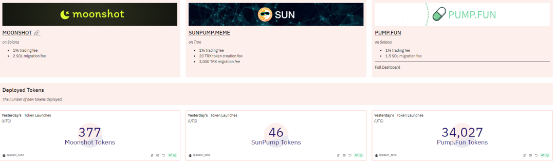 在发射机制方面,Moonshot 相较于 pump.fun 的主要改进在于支持不同外部 DEX 的初始池子添加,以及在初始打满市值时有所差异。除此之外,两者在其他方面的区别并不显著。至于 Sunpump,其整体机制与 pump.fun 相似。由于行业普遍遵循「first is first」原则,即便通过代币空投等激励手段吸引用户进行吸血鬼攻击,新进入者也很难实现大幅度超越。接下来,我们结合 dune 的数据来深入了解 pump.fun、Moonshot 和 Sunpump 的数据表现,以评估它们在市场中的表现和竞争力。