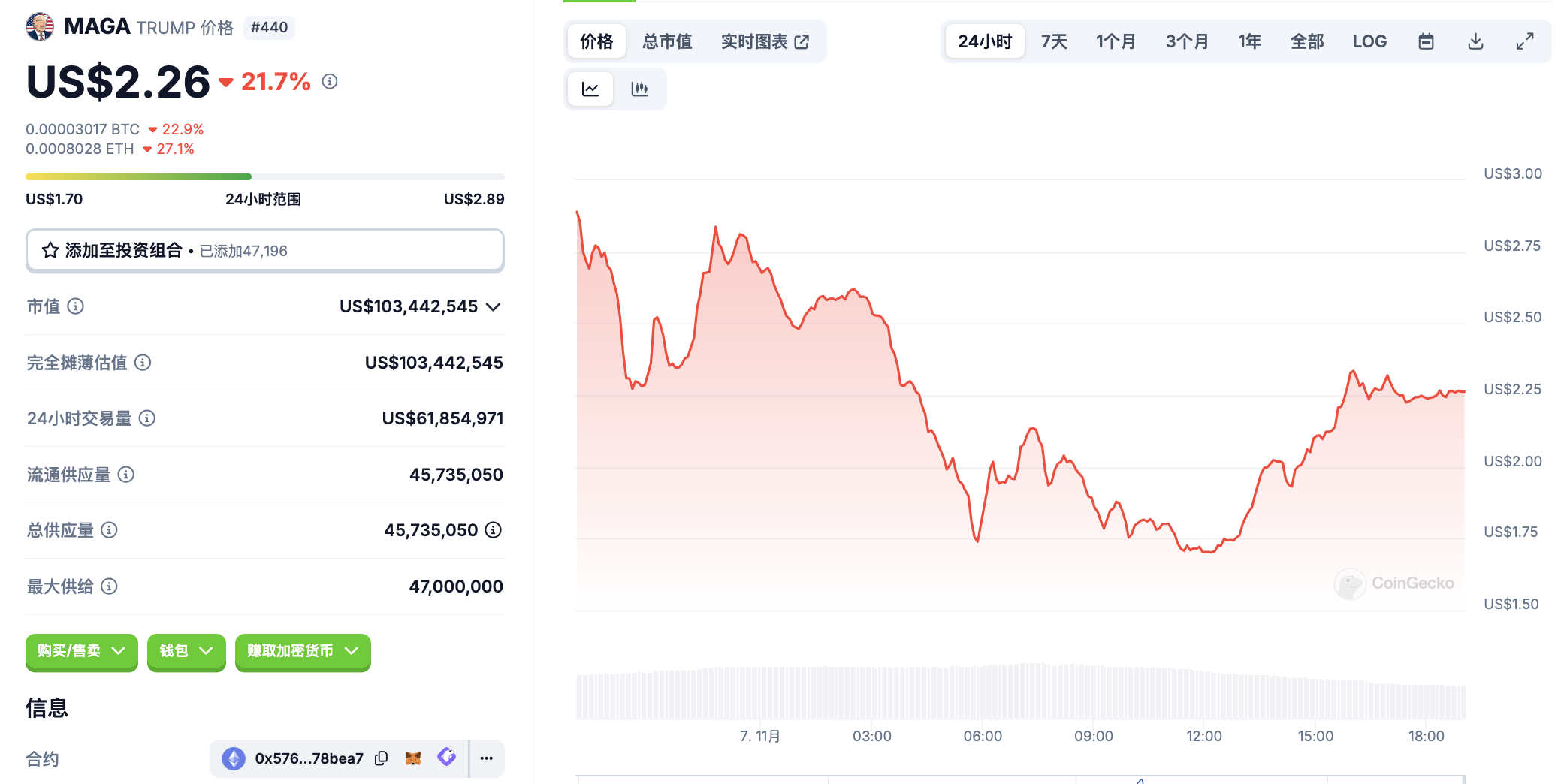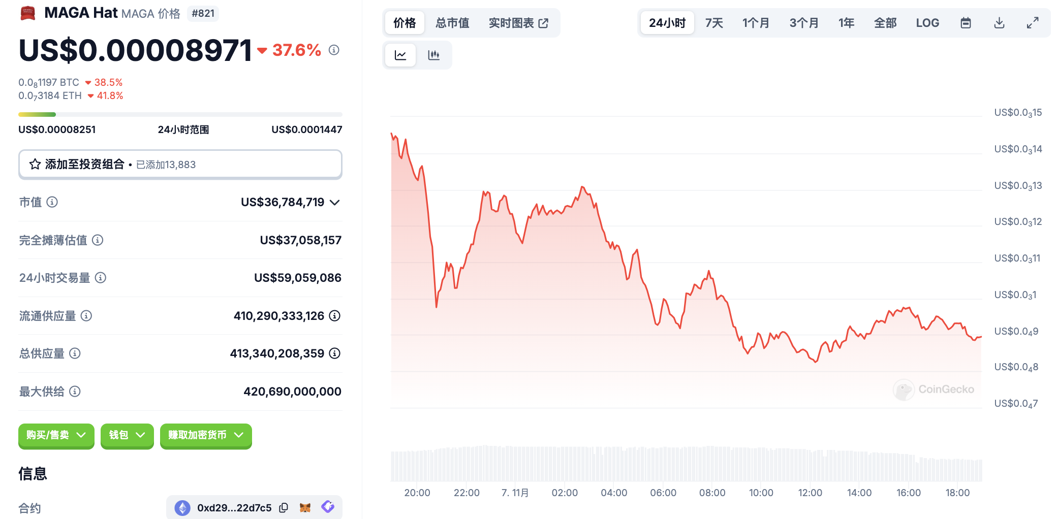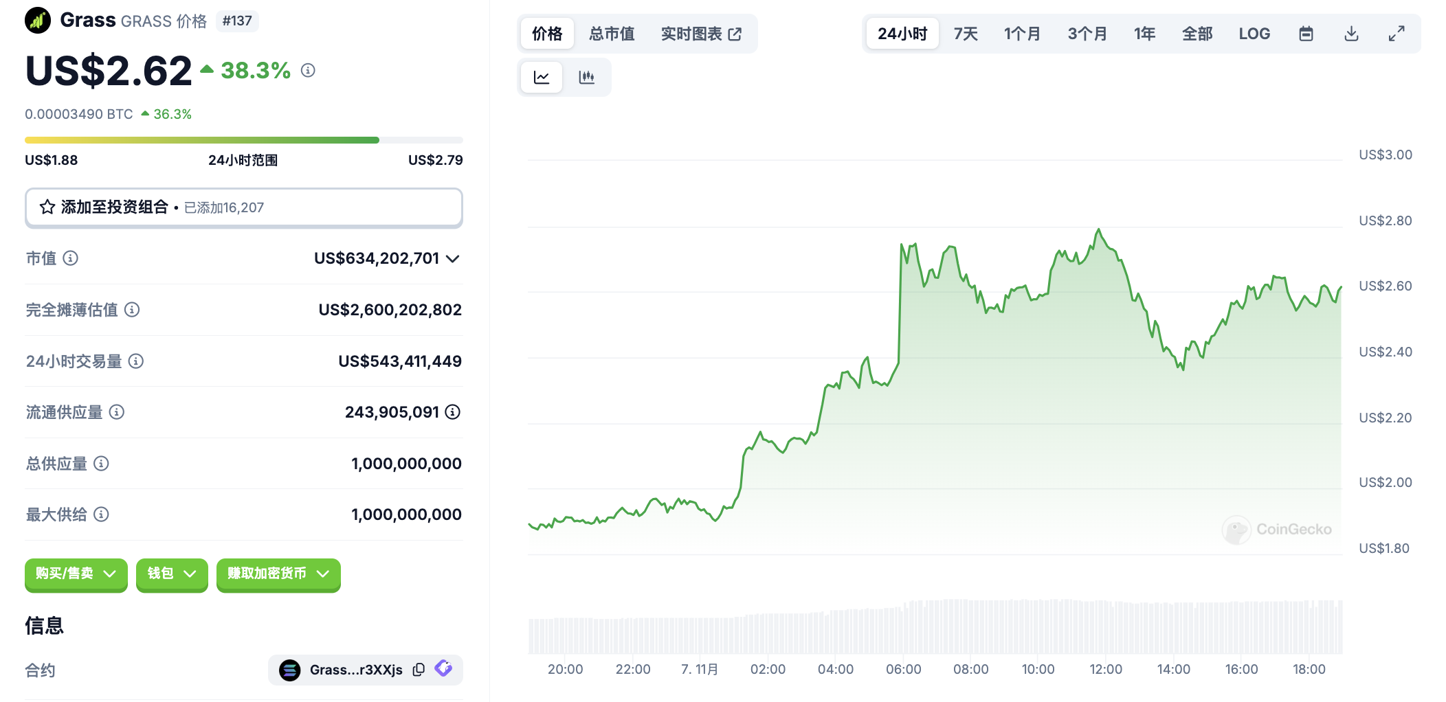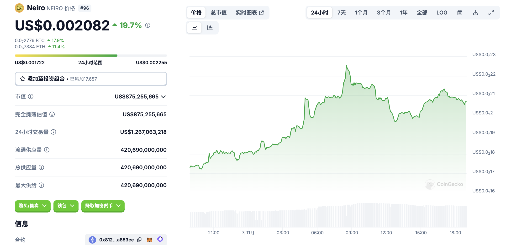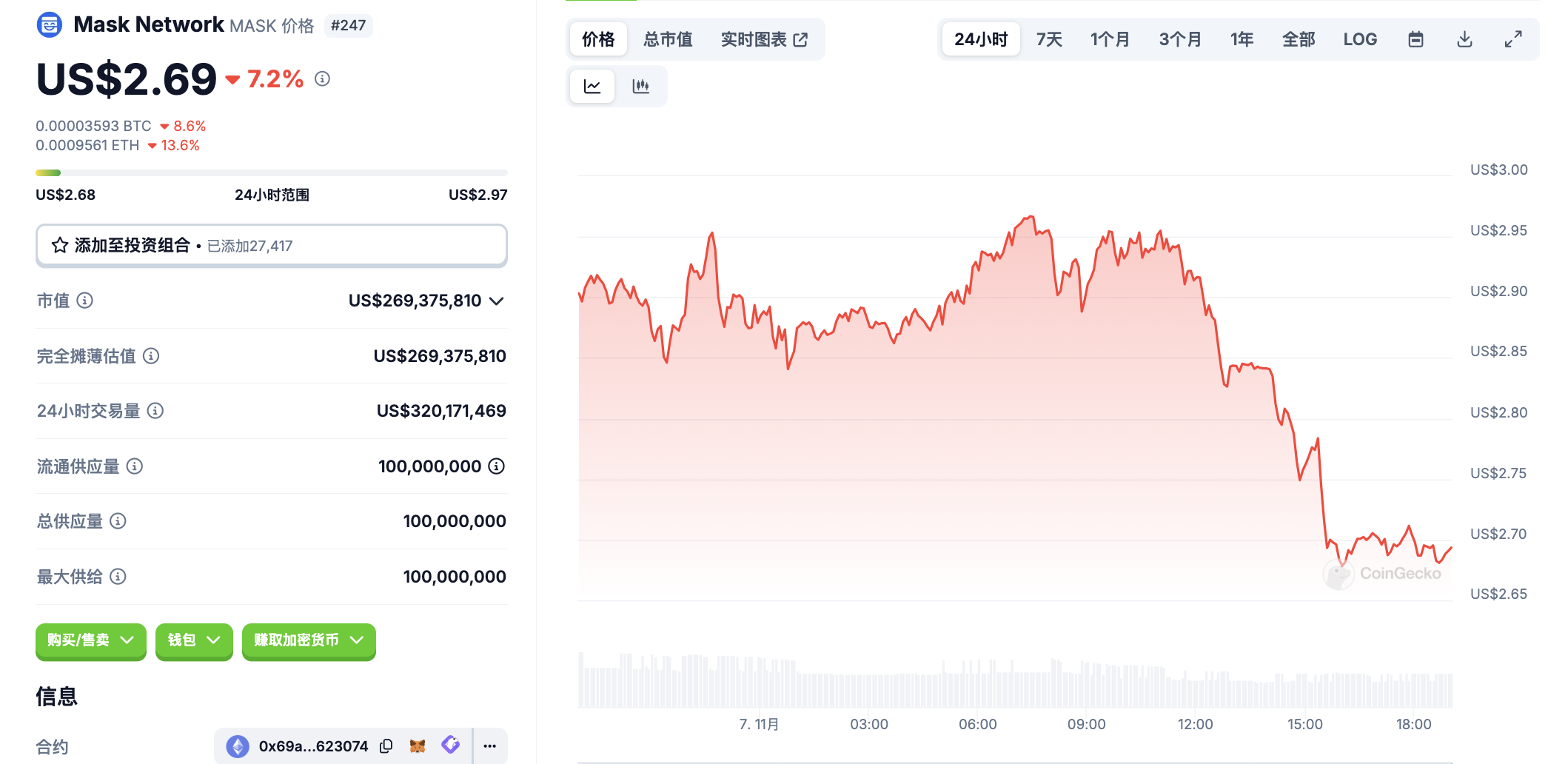 11 月 7 日代币波动情况,按交易量筛选并排列