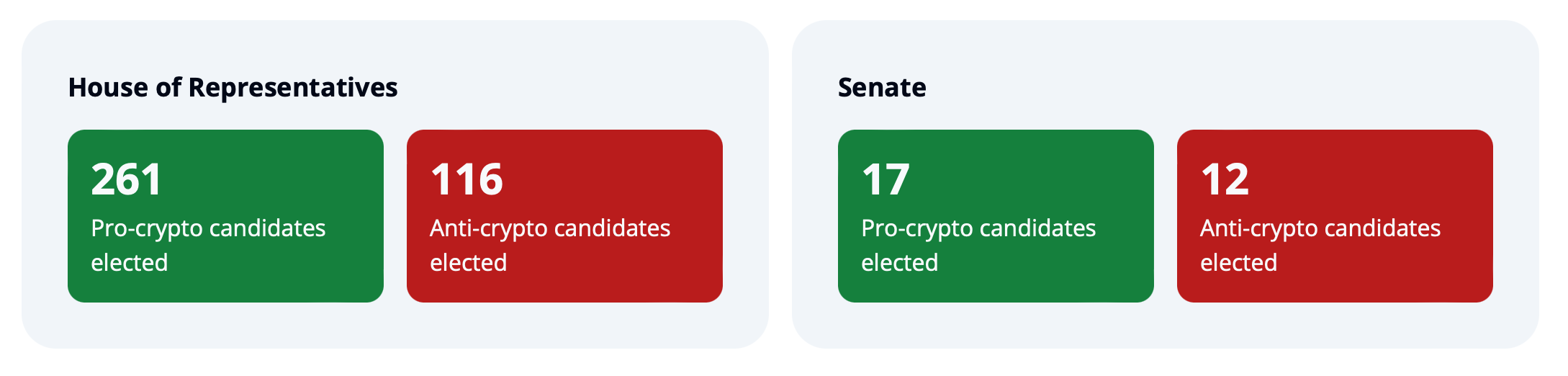 根据 Stand With Crypto 数据统计,在本次大选中,共有 261 名支持加密货币的候选人赢得了众议院席位,而反对加密货币的众议员则只有 116 名。同时,新一届参议院也更加偏向支持加密货币,有 17 位支持者,反对者为 12 位。