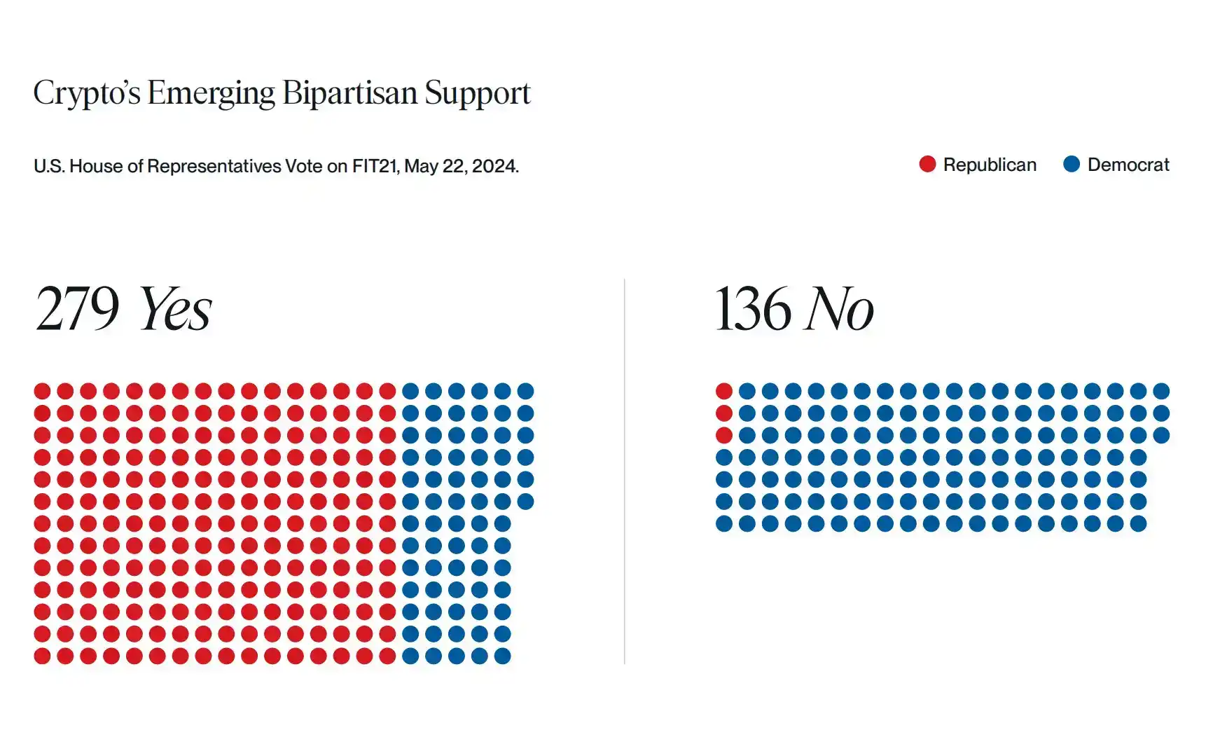 今年 5 月,FIT21 法案以 279 票对 136 票在众议院通过,该法案建立了数字资产的监管框架,并可能成为目前对 Crypto 影响最深远的法案之一。FIT21 全名为「21 世纪金融创新与技术法案」,其关键之处在于规范数字资产的监管框架,为未来更多加密资产申请现货 ETF 以及合规化道路做出了指引。