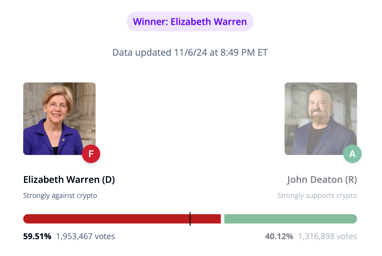 当然了,并不是整个国会都对加密货币呈现一边倒的趋势。在参议院,尽管亲加密共和党候选人 John Deaton 的到了来自加密行业的大量支持,但最终仍然输给了资深的政治资源和履历都更胜一筹的 Elizabeth Warren。这位加密行业多年的「死敌」在过去一直主张加强监管,在成功连任马萨诸塞州的民主党参议员后,她也成为加密行业在参议院中为数不多「难啃的骨头」。