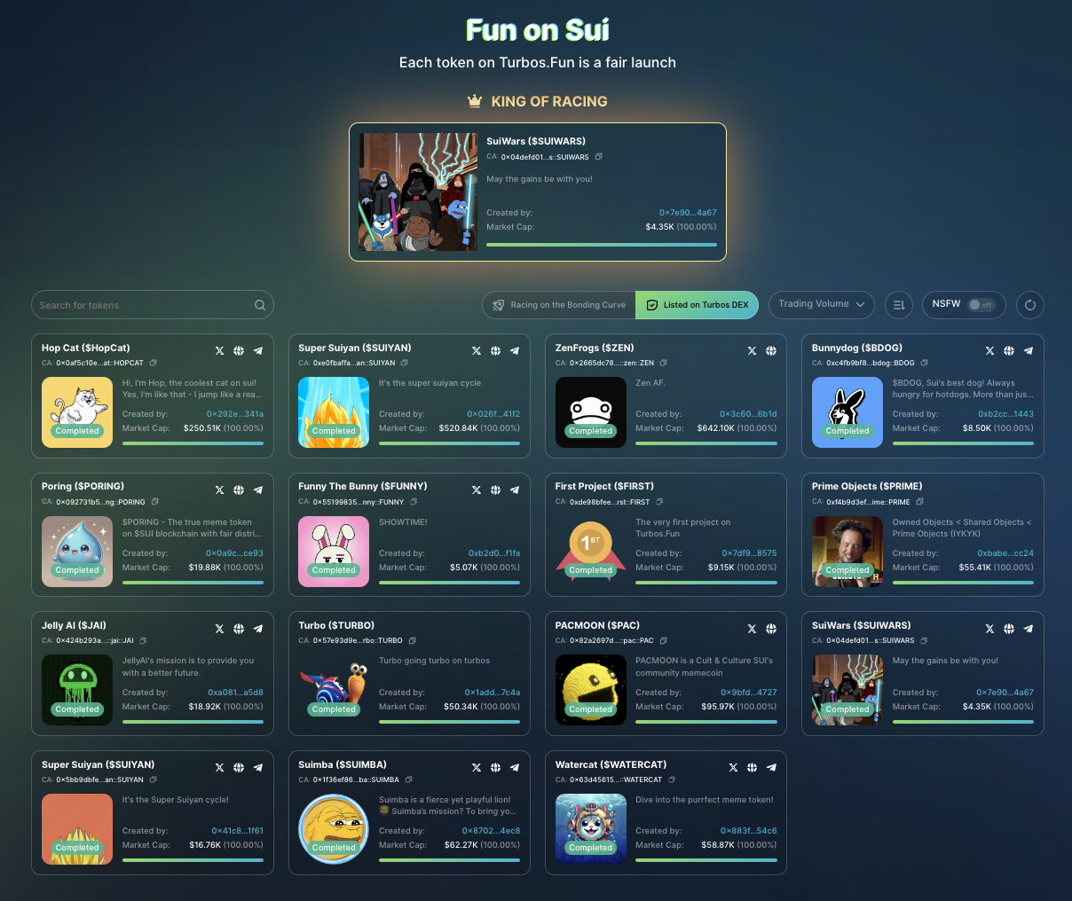 截图所示的的多个项目如 HopCat、Super Suiyan 和 ZenFrogs 等,已获得社区的广泛关注并成功上线 Turbos 的集中流动性 DEX。(每个项目都是独立运作,投资需谨慎,请务必自行研究 DYOR。)