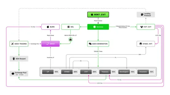 HVT 支持价格定制和代币选择等个性化部署,当它被部署使用 $SOL 或 $SOEX 来铸造,那么HVT持有者有资格参与 30%的 $SOEX 质押奖励的分配。此外,HVT 具有显著的增值潜力,随着它铸造量的增加,其价格也会随之而上涨,其持有者则可以直接收回投资且捕获其价值的增值(当前价格扣除5%手续费)。