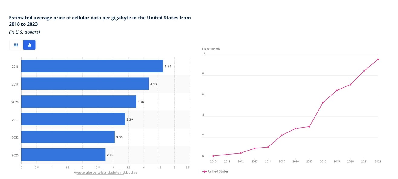 进一步比较发现,Roam 还有潜力成为用户本地生活的主要流量供应商。如结合 Statista(下左图) 和 OECD (下右图) 统计显示,目前平均每位美国人每月花费约 30 美元,消耗 10G 左右的流量。结合 Roam 使用者在非漫游情况下,通过参与 OpenRoaming 建设,每个月的无线接入成本可能降低 50% 或更多。除了成本节省之外,Roam 的社区驱动模式极大地增强了用户粘性,并创造了新的运营收入机会。