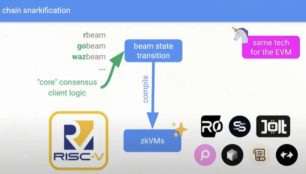 Justin Drake 认为,「PoW、PoS 之后,我们可能正在进入以太坊共识的零知识证明时代。在 ZK 时代,在这个时代,SNARKS 将成为一项不可或缺的技术。整个 Beam Chain,乃至整个共识层都可以进行 SNARK 化处理。这正是 zKVM 大显身手之时。」