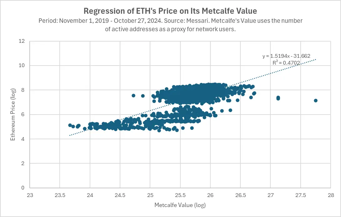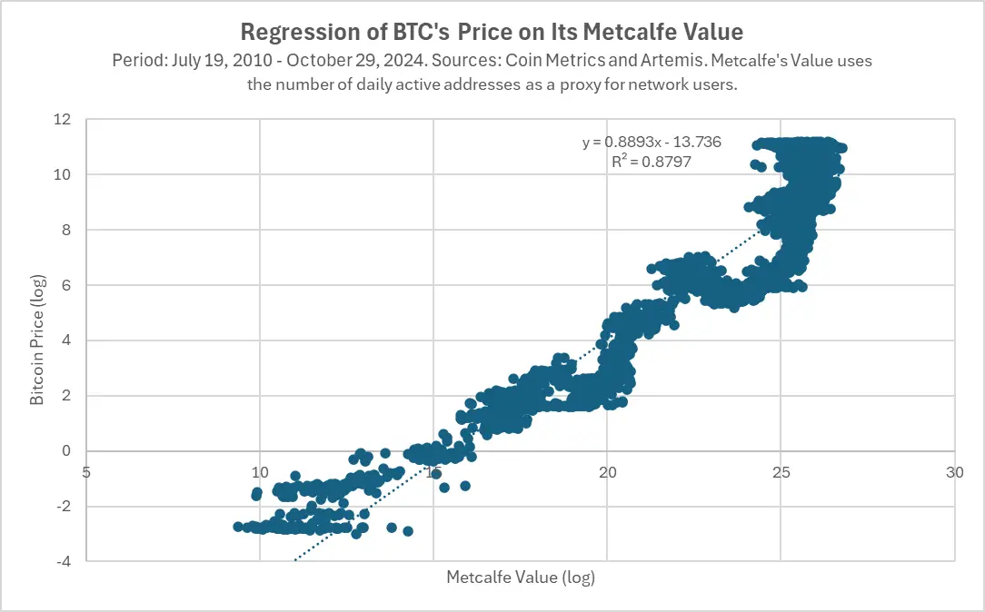 在 Web3 领域,协议的价值更多取决于其平台上的整体活动量,以及是否拥有最活跃的开发者和用户生态系统。请看我们对比特币、以太坊和 Solana 的分析,Token 价格与 Metcalfe 值(衡量网络用户数量的指标)之间存在高度相关性,这种关系在比特币的案例中已经持续了十多年。