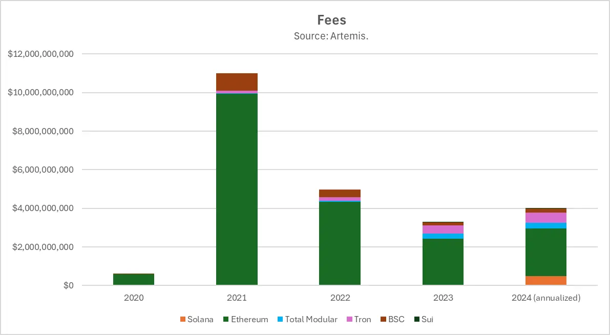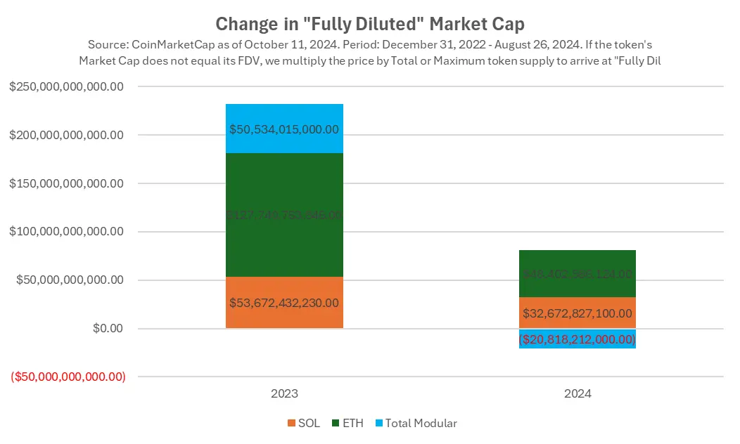 如果将以太坊和其模块化生态系统的总市值结合来看,情况有所不同。2023 年,以太坊的模块化基础设施 Token 产生的价值与 Solana 的总市值相当,约为 500 亿美元。但在 2024 年,它们整体表现不如 Solana。此外,这些 Token 的收益主要流向了团队和早期投资者,而非 ETH Token 的持有者。