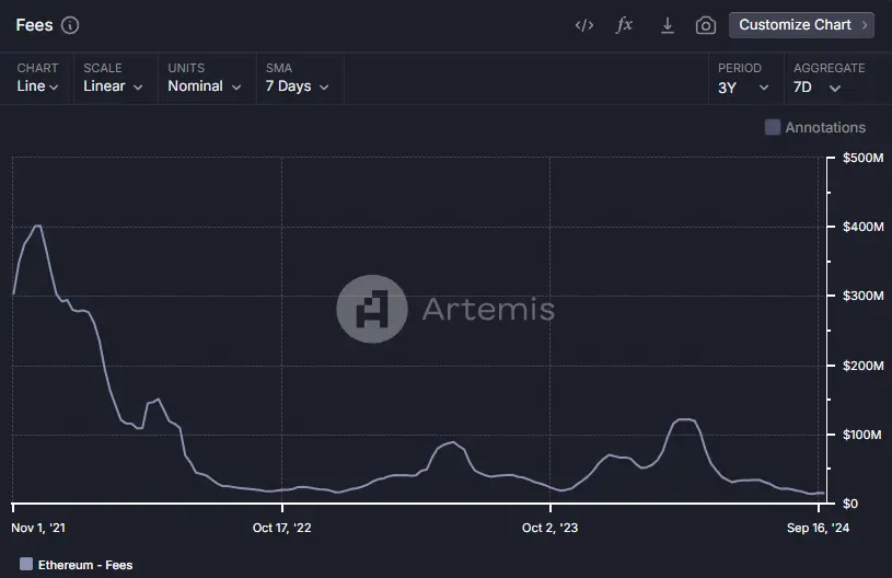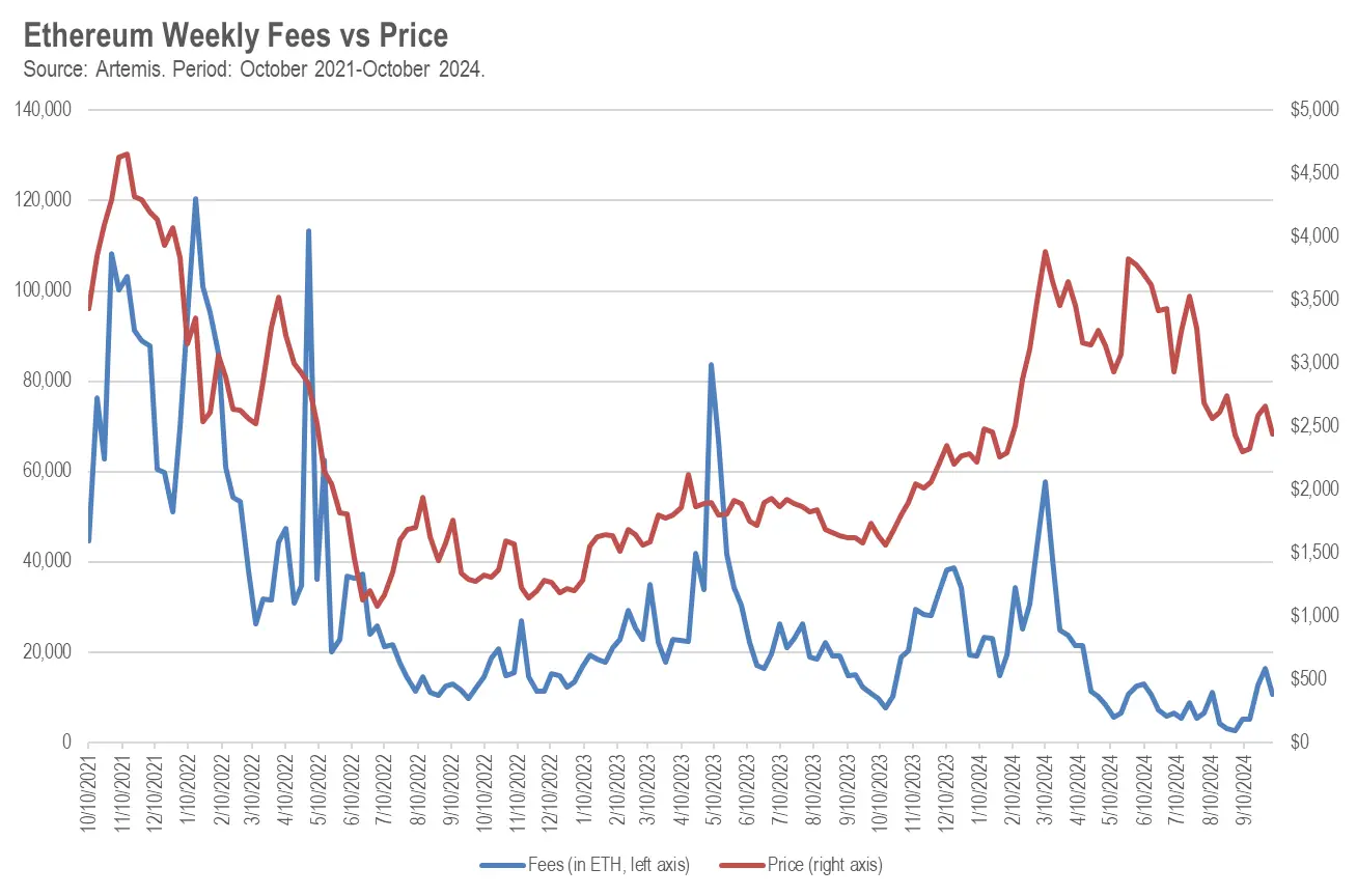 然而,随着 L2 执行层和像 Celestia 这样的替代数据可用性层的推出和发展,以太坊的费用开始下降。由于放弃了核心的收入来源,以太坊的费用和收入减少,这对 ETH 的价格产生了显著的影响。