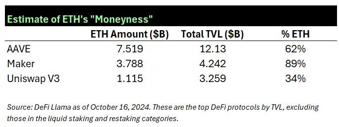 那么,ETH 是否真正从“以太坊生态系统”的主导地位中受益呢?或者说,以太坊及其模块化部分在蓬勃发展,却没有使用 ETH 作为资产?实际上,ETH 是广泛的以太坊生态系统中的重要组成部分。当以太坊扩展到 L2 时,ETH 也同步扩展。大多数 L2 使用 ETH 作为 gas(网络货币),并且大多数 L2 的 TVL 中,ETH 的数量至少是其他 Token 的 10 倍。请查看下表,了解 ETH 在以太坊生态系统中三大 DeFi 应用中的主导地位,包括主网和 L2 实例。