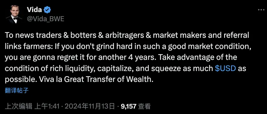 「致新闻交易员、机器人、套利者、做市商和返佣农民:如果你们不在如此好的市场条件下努力奋斗,下一个四年你们会后悔的。利用流动性充裕的条件完成资本化,尽可能多地榨取USD。财富大转移万岁。」这是Vida 在推特上的最新发言。