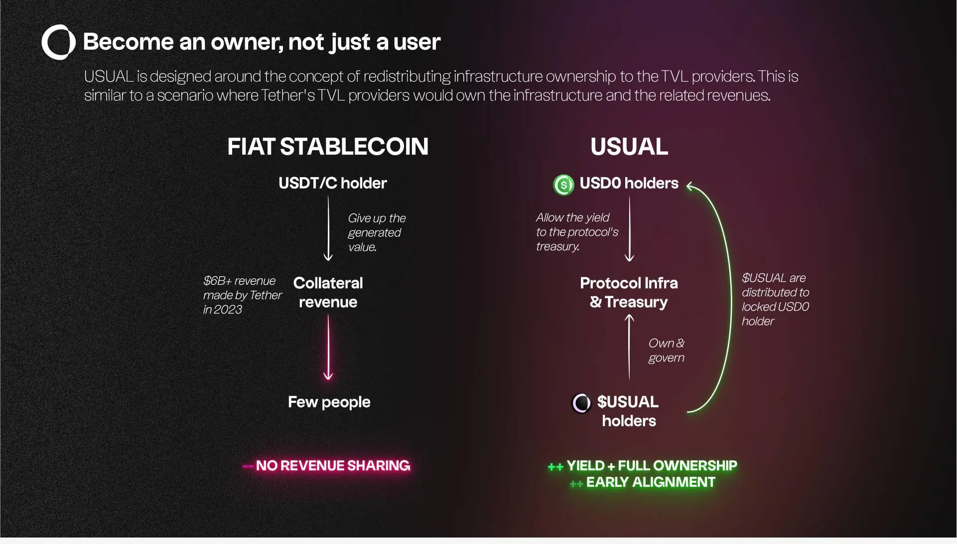 首先,2023年 Tether 和 Circle 创造了超过100亿美元的收入,估值更是突破2000亿美元。然而,为他们贡献流动性的用户却未能分享到这些巨额收益。这种中心化机构将利润私有化,而将风险社会化的模式,与去中心化金融的初衷背道而驰。