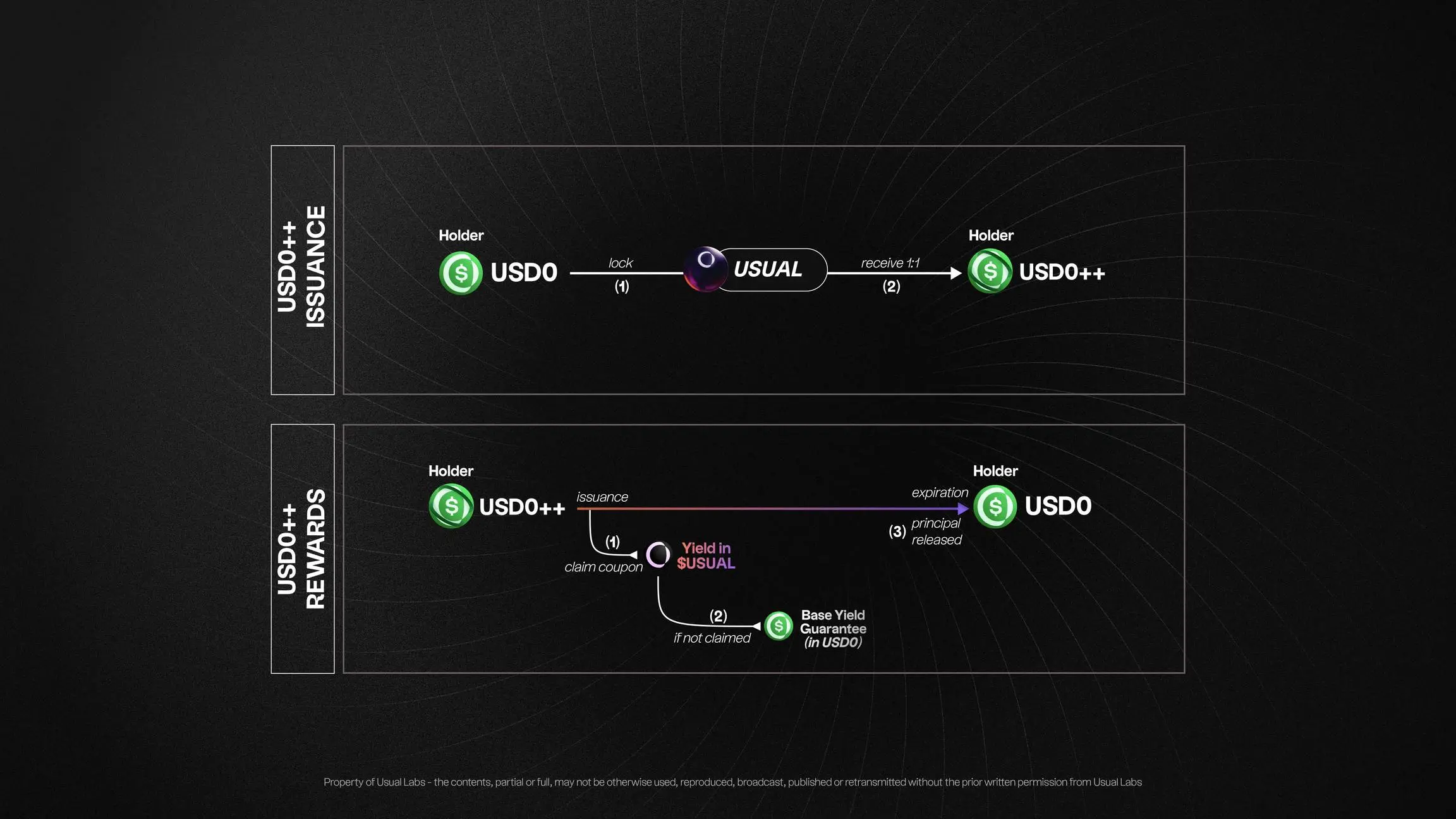 USD0++ 是 Usual 生态系统中的创新产品,本质上是一种增强型国债。通过增强的4年期DeFi国库券,由4年内锁定为USD0的本金担保,确保本金能够回收。它允许用户从协议的增长和成功中受益。与传统模式不同,USD0++不仅提供协议收入,还通过其创新的奖励机制分配协议的所有权。